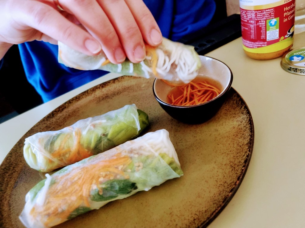 Die Karte klein, aber fein. Man ist hier für die Sommerrollen bekannt, also nehmen wir die mit Rindfleisch als Vorspeise. Die sind ausgezeichnet, sogar laktosefrei, was man ihnen aber nicht ankennt um den Preis von EUR 9,50. Ich frage mich, wie man in so eine asiatische Reismehlwalze überhaupt Laktose hineinbekäme, wenn man das aus irgendeinem Grund wollte.