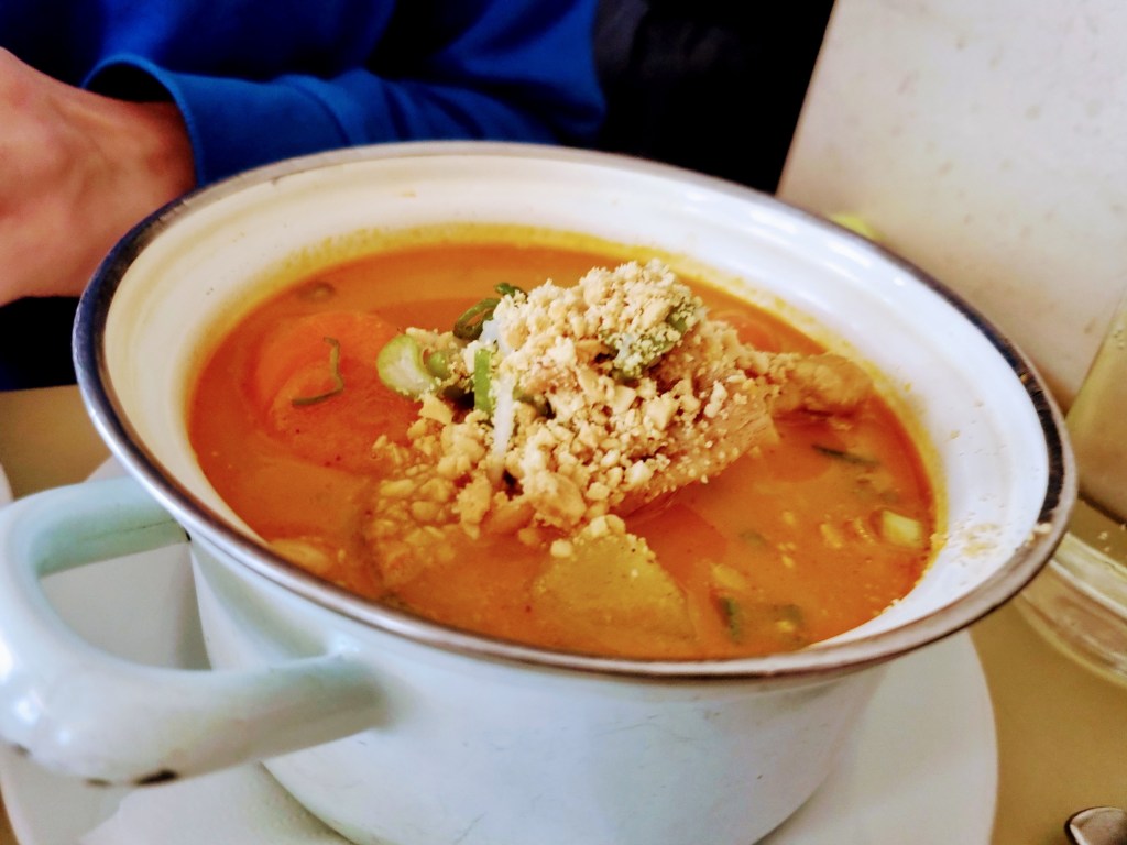 Die große Mitesserin nimmt ein Cari, also ein Hühner-Kokos-Curry (EUR 14,00), das im hübschen Riess-Emaille-Topferl daherkommt. Die kleine Mitesserin bekommt zur Abwechslung wieder einmal ein Gläschen, verkostet aber auch unsere Speisen.
