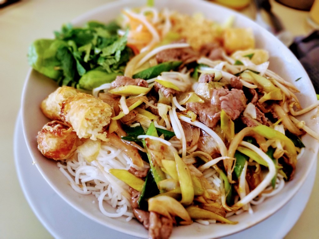 Als Hauptgang gibt es Bun (EUR 15,50), die Rindfleisch-Fassung mit Gemüse, Blattsalat, Reisvermicelli, Sapanem, Rettich-Salat, Minze und Erdnüssen. Das ist zugegebenermaßen genau so, also würde man den Inhalt von sieben Sommerrollen sortieren und in einer Schüssel auflegen, aber ich mag das halt.