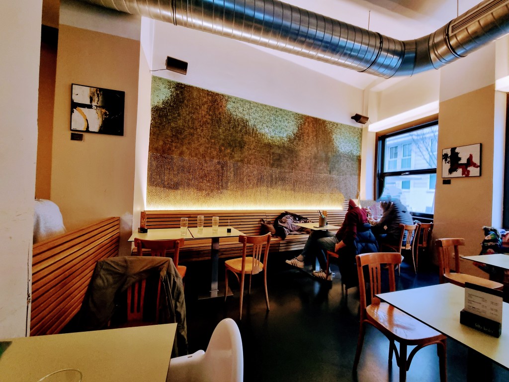 Hier sieht es nur teilweise so aus, wie ich mir das Innere eines Avocadokerns vorstelle. Ist aber trotzdem lässig: das obligate freiliegende Lüftungsrohr, etwas zu kleine Resopaltische, um die Holzsessel vom Flohmarkt stehen, Turnsaalboden.