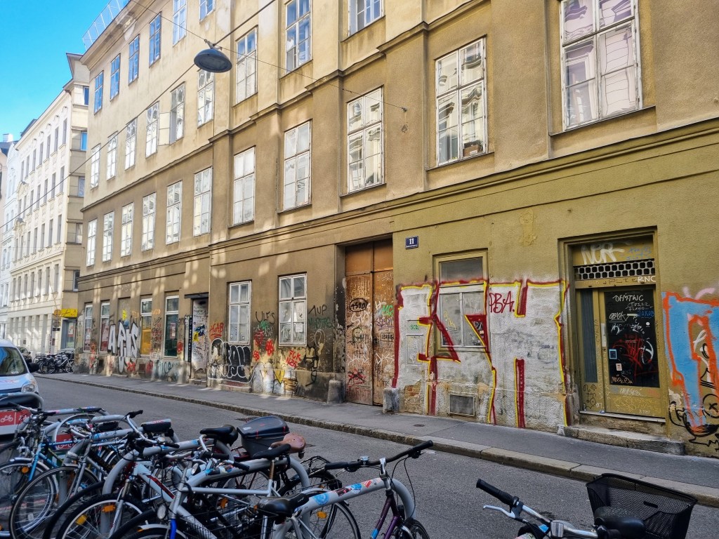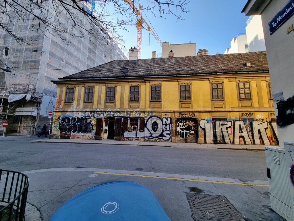 Nach der Querung der Zollergasse wird die Mondscheingasse noch wilder. Hier hat der KSŠSD seinen Sitz: der Klub slovenskih študenk*študentov na Dunaju, also jener der slowenischen Student*innen in Wien. Gut getarnt als kommunistisch-anarchistische Zelle oder so, zumindest erweckt das Äußere diesen Eindruck. Schlau gemacht, so läuft man nicht Gefahr, dass sich hier versehentlich ein paar Faschisten in den Klub verirren. Oder ganz normale Menschen.