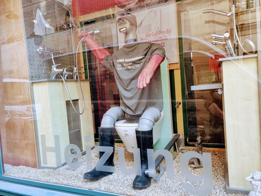 Der Avocadokern in uns treibt uns aber zurück in die Zollergasse, Richtung Gasthaus Sapa. Auf dem Weg dahin zeigt sich die pulsierende Kreativität Neubaus in all seine Wirkmacht: da sitzt in der Auslage eines Installateurs eine Figur aus Plastikrohren mit Gummistiefel und Kapperl auf einer Kloschüssel. Es ist Bender aus Futurama.
