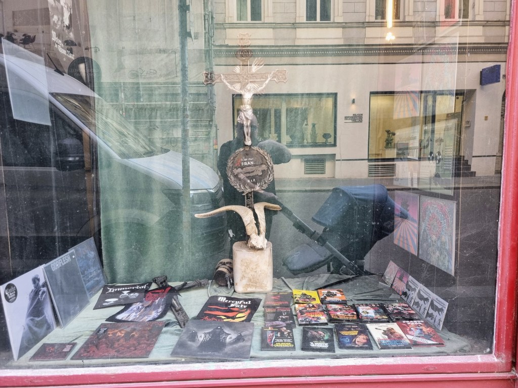 Gleich daneben sind die Auslagen mit Grabkreuzen geschmückt. Im schwarzwandigen Geschäftslokal leuchtet ein umgedrehtes Neonkreuz. Ich weiß nicht genau, was hier verkauft wird, Schallplatten und verlorene Seelen, vermute ich.