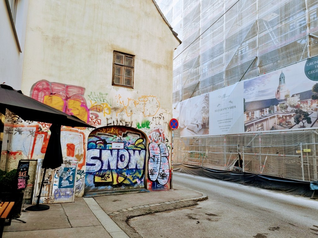 Die Mondscheingasse aber fällt sofort ins Auge: hier ist Neubau nicht mehr shabby-schick, sondern unabsichtlich schirch. So war es hier noch vor wenigen Jahrzehnten, heruntergekommen, wild. Graffiti! Damals, als sich die gemeine Josefstädter Hofratswitwe kaum über den Limes der Lerchenfelderstraße gewagt hat, zumindest nicht ohne den vermeintlichen Schutz einer schnorchelnden Diwanwalze mit kupiertem Schwanz und eingedrückter Schnauze. Heute tragen die Neubauer selber Dutt, nur ohne Haarnetz. Oder einen Helm aus Haaren, wie Mireille Mathieu, nur selbstgeschnitten.