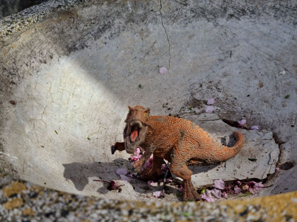 Umso dichter wirkt das Ensemble. Eine Insel, ein Zeitportal. Hier findet sich noch das eine oder andere Grab mit Nazi-Rune und einen Sowjetfriedhof mit Massen- und Einzelgräbern. Und aus der leeren Blumenschale des Physikrates lugt ein kleiner Gummidinosaurier hervor. Ein Tyrannosaurus Rex. Anderswo steht: wife, mother, daughter, sister, friend. 1926–2023. A life well lived. – Gerichtet. Und gerettet.
