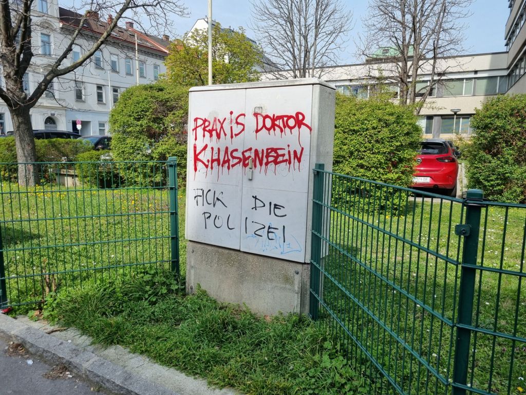 Wie ich aber auch sehe, ist die Akademikerdichte nicht zu unterschätzen. Da gibt es einen Computerdoktor. Und einem aufgesprühten, glaubwürdigen Hinweis zufolge ordiniert hier auch ein „Doktor K. Hasenbein“. Möglicherweise onaniert er auch, zumindest dürfte er schmutzige Phantasien mit Polizisten haben, dem Graffiti zufolge. F… die P…