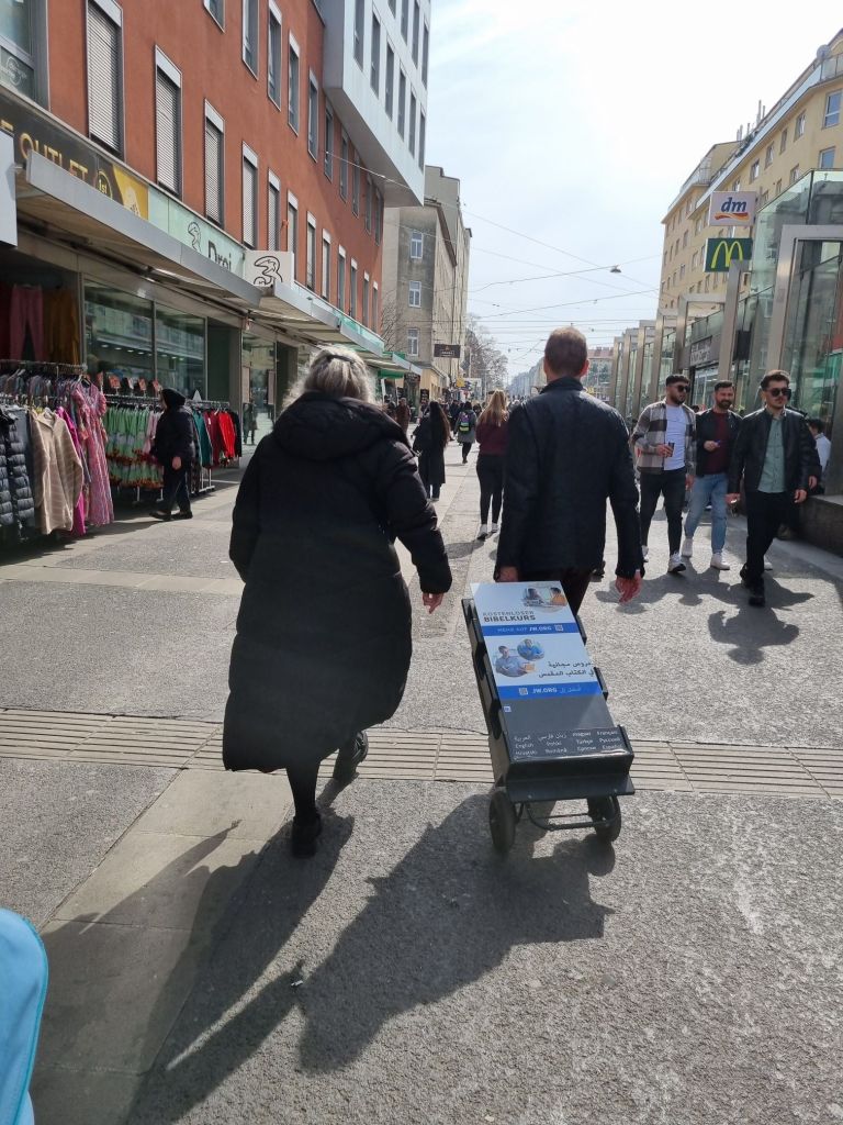 Eine Romafrau läuft durchs Bild, prächtig gekleidet, mit Gold und Kindern behangen, wie ich es aus Rumänien kenne. Wir geraten in ein kleines Rudel Zeugen Jehovas, das gerade seinen letzten Standplatz für heute bezieht. Wir werden für ein paar Minuten U-Boote in einer speziellen Welt der Psalmen und des Glaubens. Die Gespräche, die sie führen, sind kultiviert und zielgerichtet. Die Mission lautet Mission. Es geht um die Zukunftsängste der Menschen und um den Sinn im Leben.