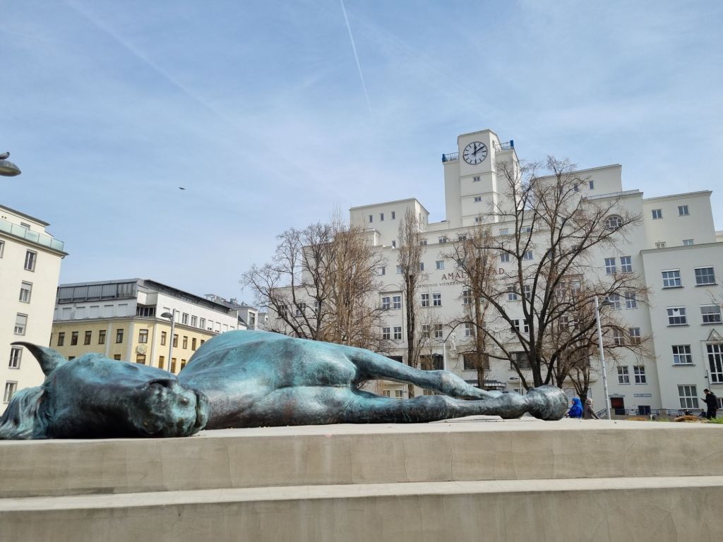Hinter ihrer Stellung das ominöse Denkmal mit einem offenbar toten Bronzepferd, das aber eigentlich nur schläft, wie ich erfahre. Es streckt seinen Hintern Richtung Amalienbad, dessen beeindruckende Architektur den Reumannplatz dominiert.