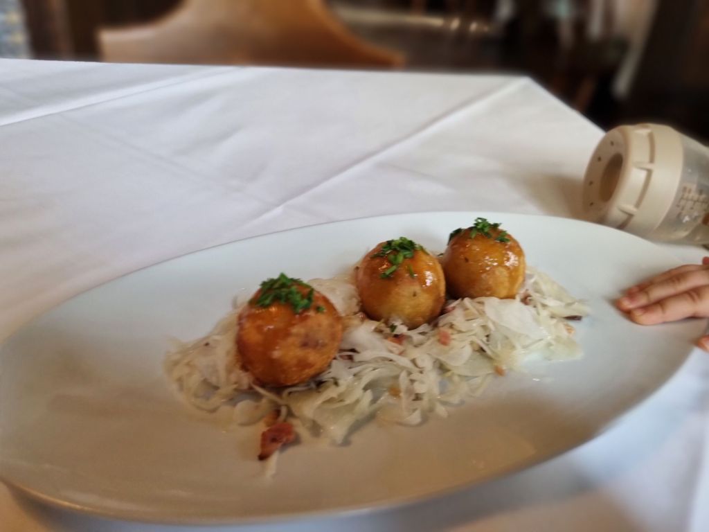 Die Mitesserin bekommt eine ordentliche Portion Nockerln mit Saft (EUR 11,80). Sie kostet aber gerne auch bei den legendären Grammelknödel auf lauwarmen Speckkraut nach Art des Hauses (gebacken! lovely!) mit, die wir als Vorspeise (EUR 13,20) bestellen.