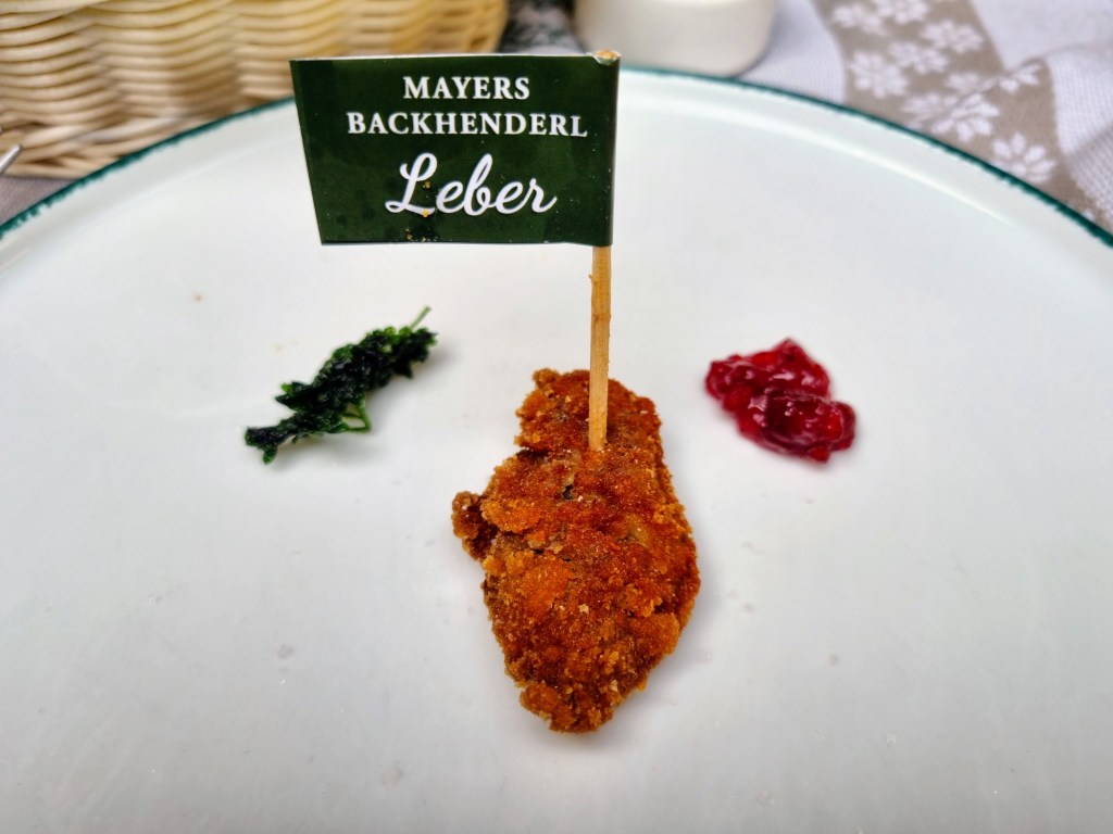Wir haben einen Vorsprung, unsere Speisen werden bereits aufgetragen. Vor uns ein ordentlich paniertes und ausgebackenes Hendl, fast frivol, wie es da vor mir liegt, nur mit frittierter Petersilie notdürftig bedeckt. In der Leber steckt ein Fähnchen, das die Leber als solche markiert. Eine feine Idee, die Speisen mit didaktischen Gimmicks auszustatten. Möglicherweise sind hier öfters Studenten der Veterinärmedizin zu Gast.