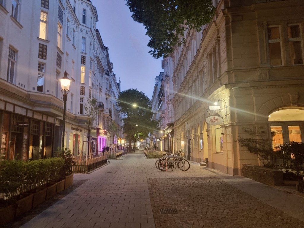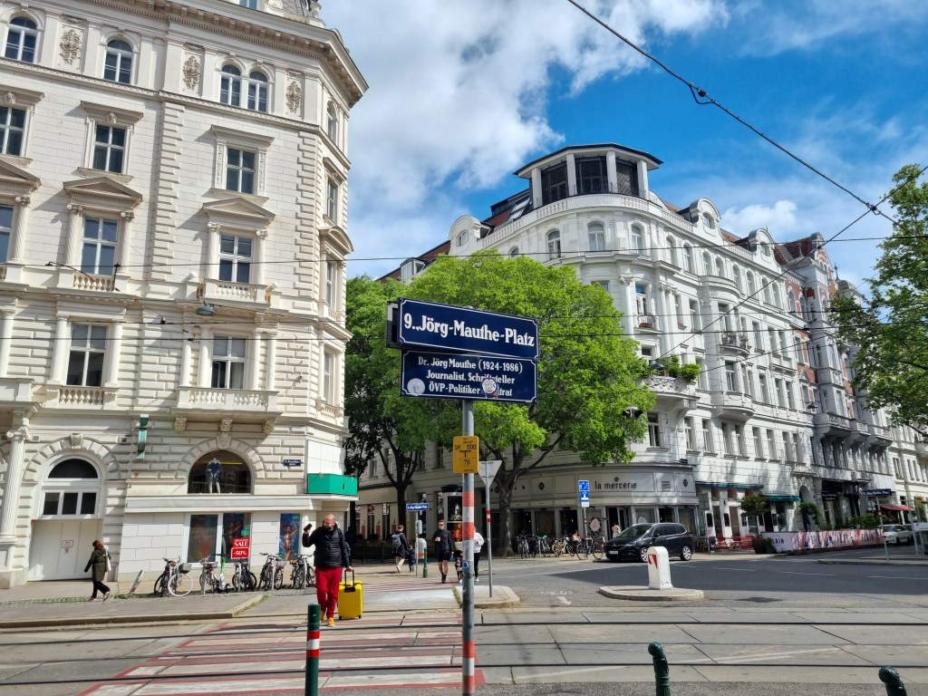 Die Schwarzspanierstraße und weiter die Berggasse hinunter in die Rossau, zu der das Servitenviertel gehört. Über den Jörg Mauthe- Platz rollen wir in die schöne Servitengasse. Hier sagt man Wien einen speziellen französischen Flair nach. Und hier schlägt ein Herz von Bobostan, der Republik der „Bourgeoisen Bohemiens“. Ein Volk, das sich vornehmlich um Wiener Märkte sammelt, gleichzeitig Yuppies und Hippies, je nach dem, was gerade angenehmer ist.
