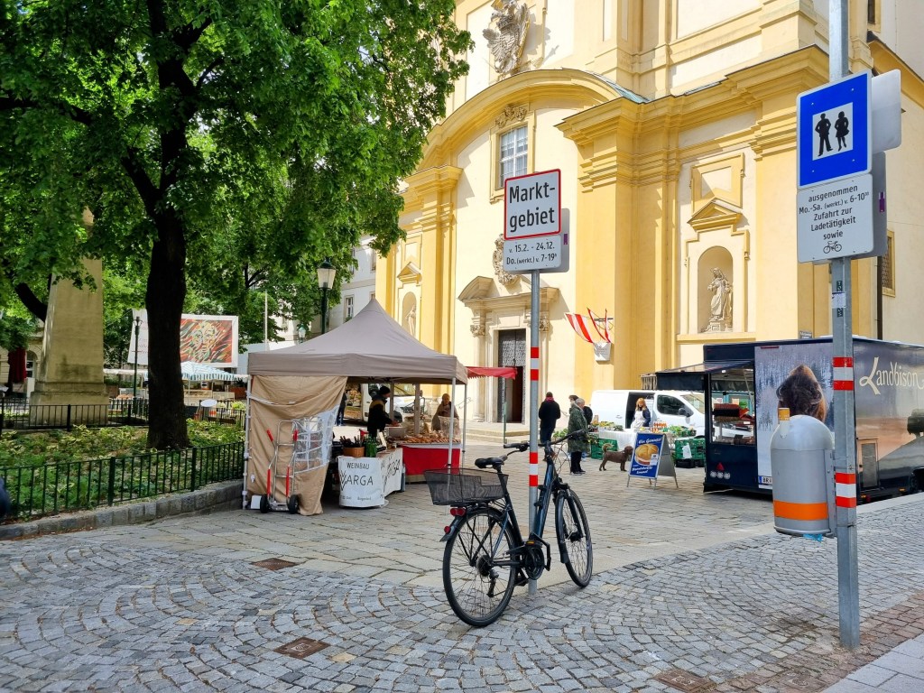 Also, der Markt vor der Servitenkirche. Über den vom Naschmarkt stammenden Delikatessen hängt ein großes Banner: Christus ist wahrhaftig auferstanden. Es ist halb elf, die Bobos sind wohl auch schon aufgestanden, aber noch nicht auf der Straße. Offenbar ist gerade Laptopstunde.