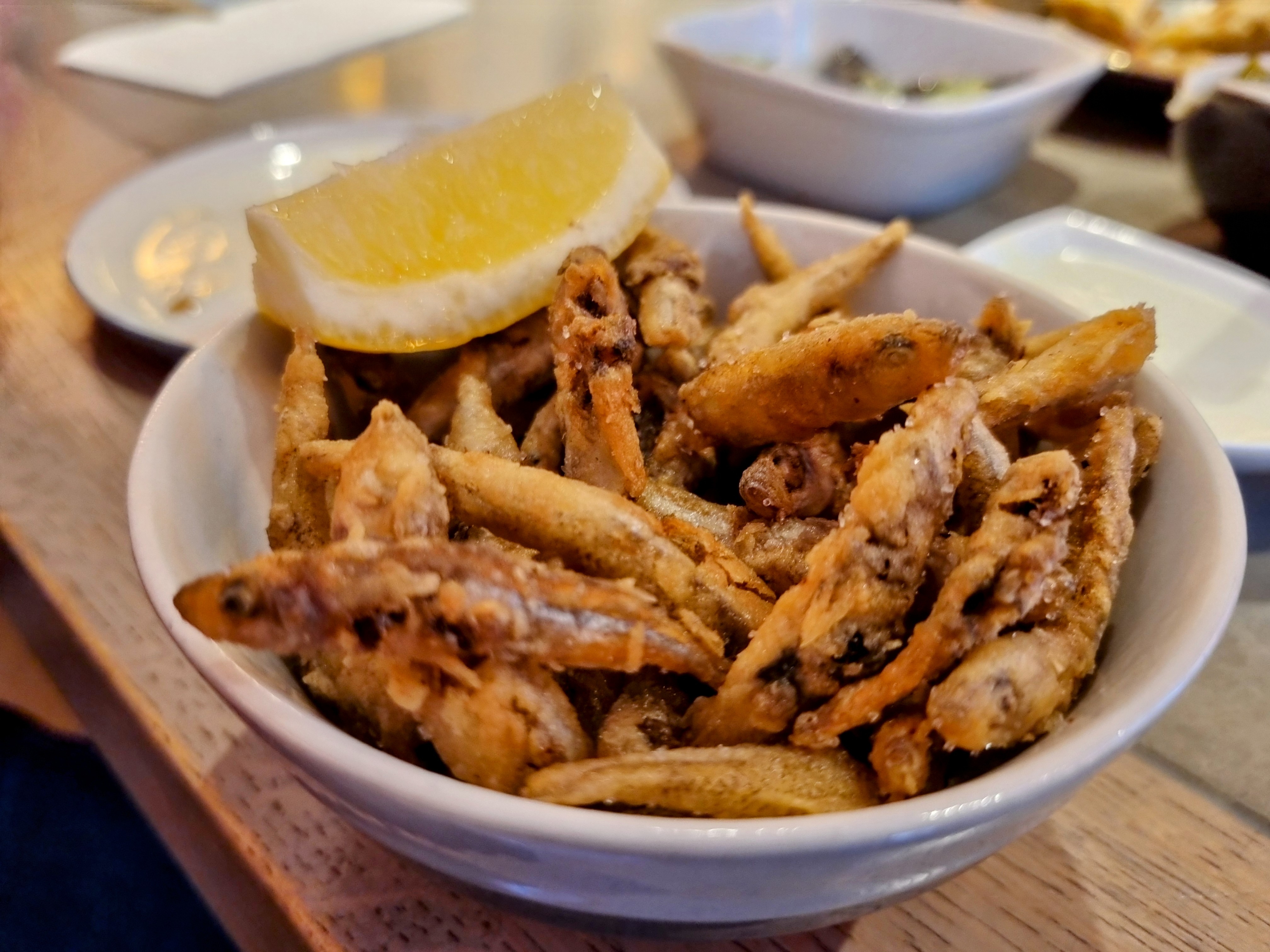 Leider habe ich keine Ahnung, wer dieser Wokfried ist, nach dem das letzte Gericht benannt ist. Auf die Hühnermägen verzichte ich, hatte heute ja schon, zumindest gedanklich, einen Magenstrudel. Von den knusprigen Ährenfischen lassen wir uns aber noch eine zweite Portion bringen. Sie passen wunderbar zum Andechser Bier und zum Frühroten Veltliner, der sich mitunter auf der ansehnlichen Weinkarte, anschließend auch auf meinem Gaumen findet.