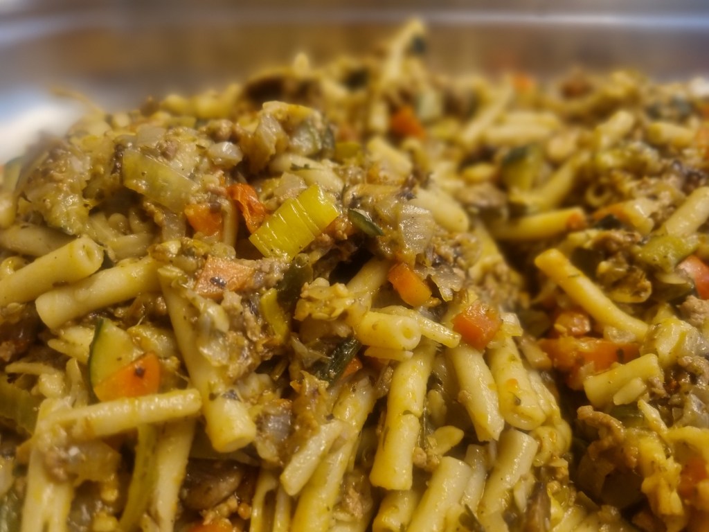 Wir sollten am Vortag auch einen längeren Abend gehabt haben, während wir alle jene Zutaten zerkleinert haben, die es einen Tag lang im vorgeschnittenen Zustand aushalten. Und die Strudel, immerhin 19 Stück, die haben wir gleich komplett vorgebacken.