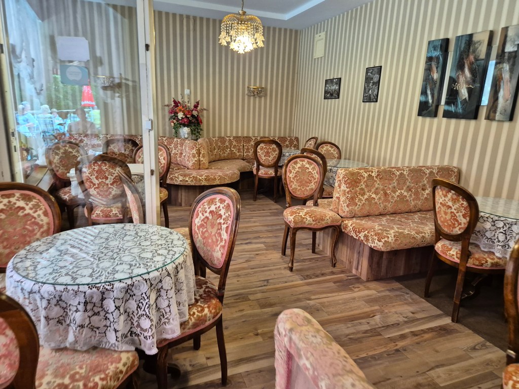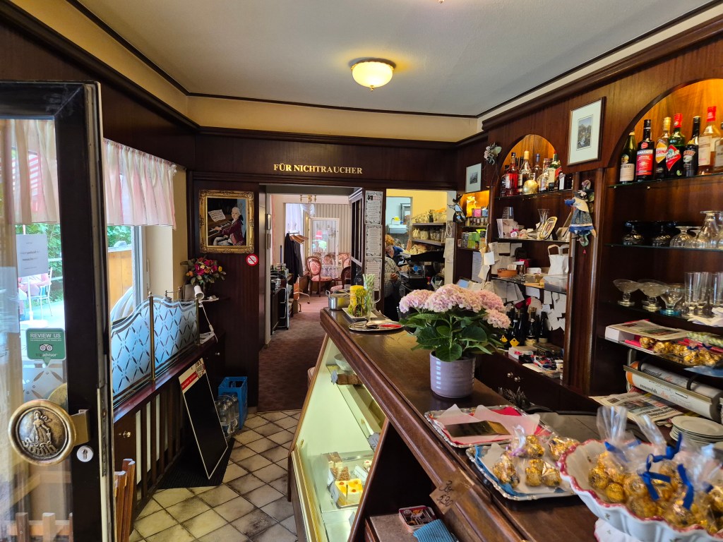 Wir genießen den Time Travel Gastein, sitzen über zwei Stunden im Schanigarten. Immer wieder mache ich kleine Ausflüge ins Innere: der Gastraum (für Nichtraucher!) aus einer undefinierbaren, längst vergangenen Zeit, an der Tapetenwand alte Stiche und Gemälde, und auch welche aus dem Möbelhaus, eine Vitrine mit den Torten dann im Nebenraum. Eine Durchreiche zur kleinen Küche. Die teppichüberzogenen, schmalen Stufen ins Obergeschoß, wo sich die Toiletten befinden. Eine alte Kaffeemaschine auf den Dielen abgestellt, von einer Tischdecke verhüllt. Verstaubte Plastikblumen obendrauf.