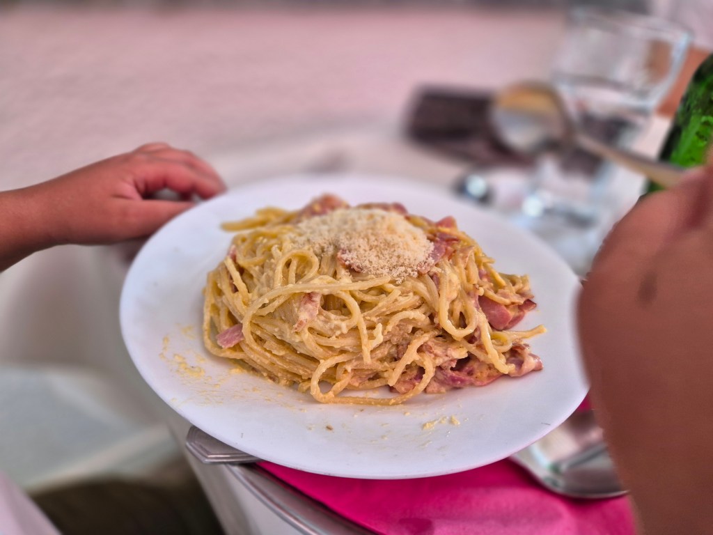 Schnell geht hier nichts und neu ist hier nichts, aber der italienische Chef hat einen Bart wie der (österreichische) Kaiser. Die Kellnerin nicht, aber die ist auf zack, ich bin „der Herr mit dem Kinderwagen“, Sie müssen verzeihen, wir kategorisieren die Gäste ein bissl für uns. Keine schlechte Idee, so spart man sich die Tischnummern, denke ich mir.